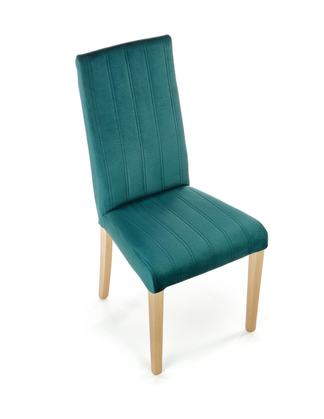 Krzesło wyróżnia się pikowanym oparciem i siedziskiem, a także eleganckim, ciemnozielonym kolorem z pionowymi pasami.
