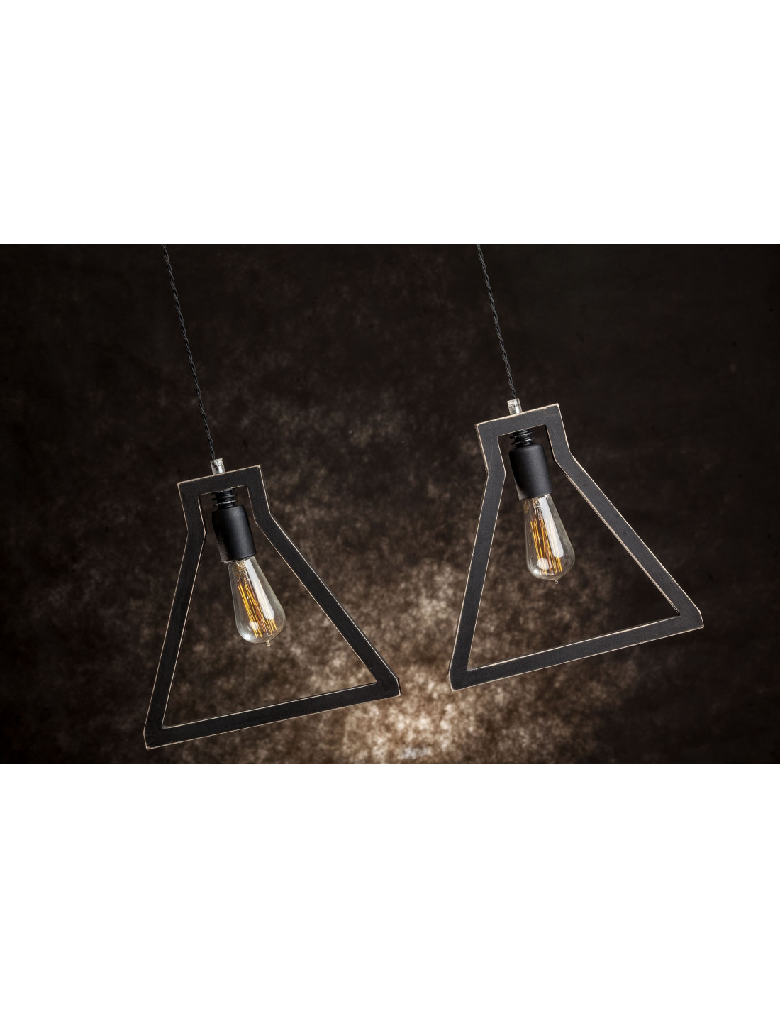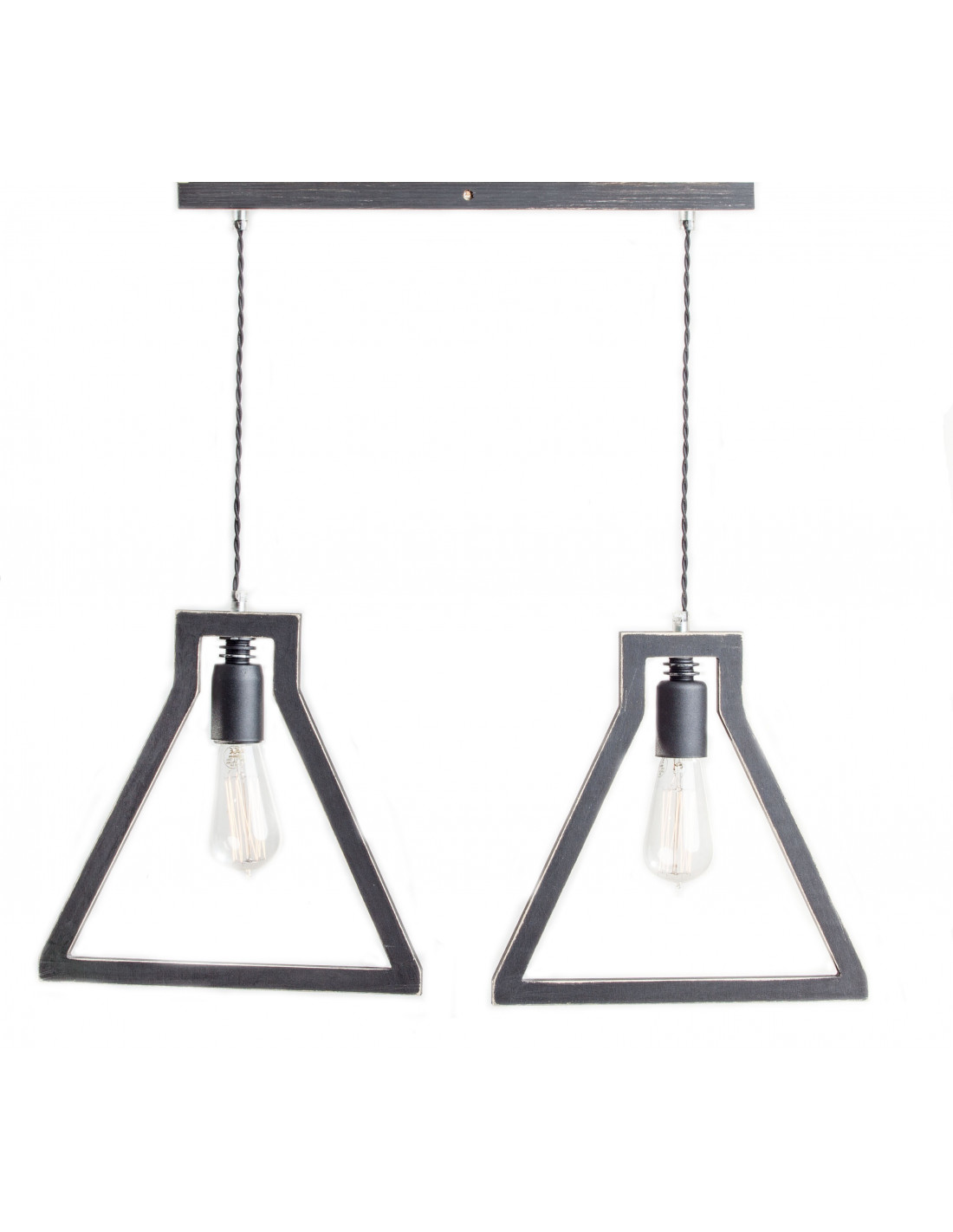 Lampa LAMPADINA 2 kształtem przypominająca zarys dwóch żarówek, wykonana jest ze sklejki o grubości 1,7 cm, którą pomalowaliśmy na kolor czarny i przetarliśmy . Dopełnieniem jej są elementy metalowe wyglądające jakby były nie domalowane też w kolorze czarnym. Ekspresji dodaje też czarny kabel podwójnie skręcony w bawełnianym oplocie. Lampa wyróżniająca się designem,dobrze się wpisuje w różne wnętrza.