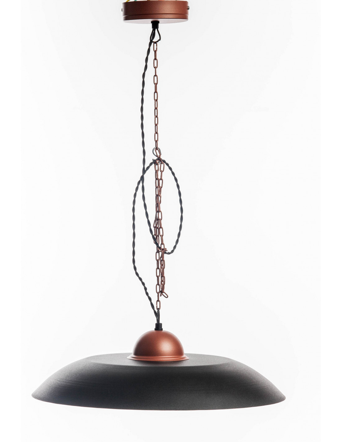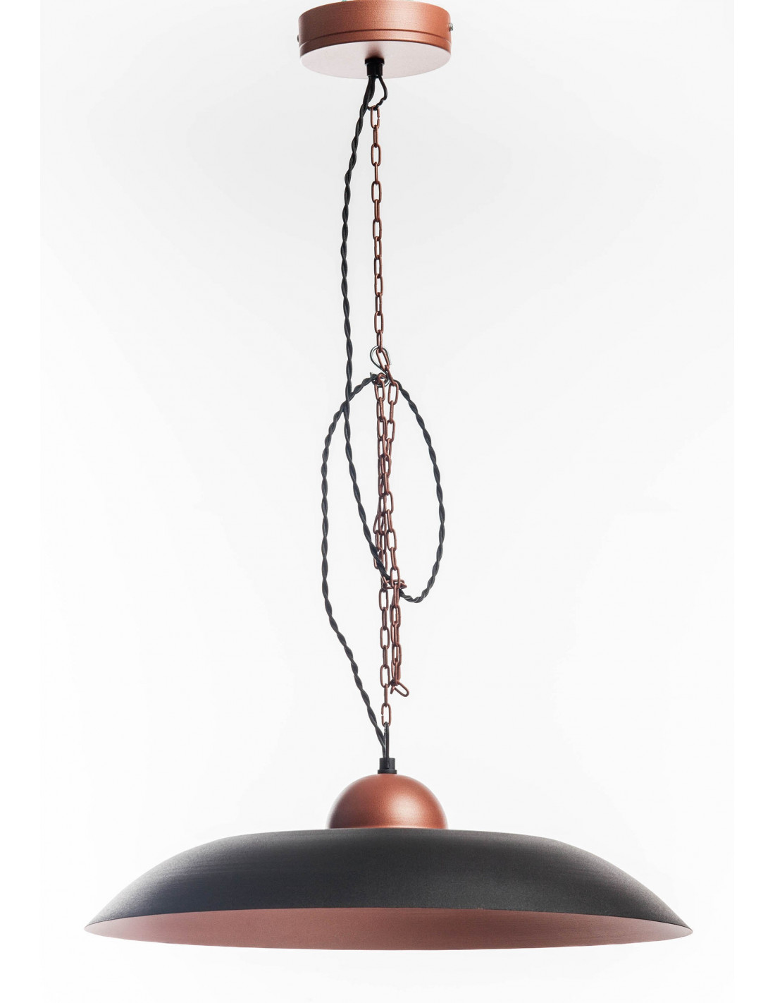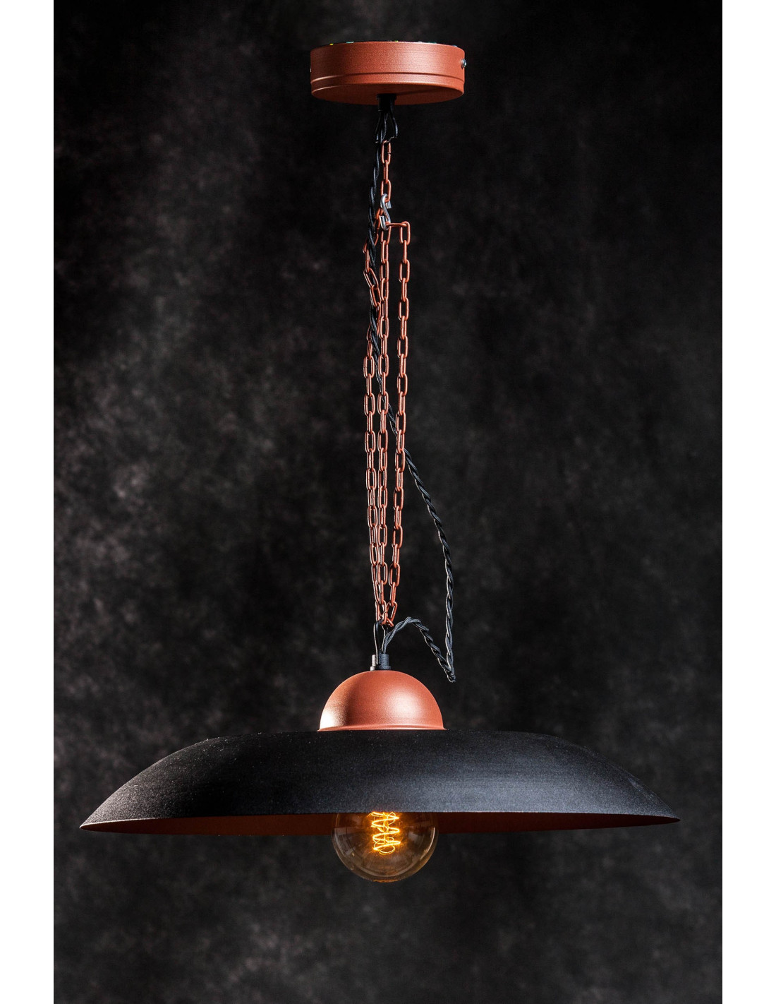 GUCIO 44 przepiękna lampa loftowa o dużej średnicy bo aż 44cm.Pomalowana proszkowo farbami strukturalnymi.Dominującymi kolorami jest miedź struktura i czerń.Unikatowa forma regulacji wysokości-prosta i łatwa do łańcuszka dołożyliśmy haczyk w kształcie litery "S". Tworząc ją myśleliśmy o dużych wnętrzach z dużymi stołami ale nie koniecznie, oświetlić też potrafi spory pokój po dobraniu odpowiedniej żarówki.
