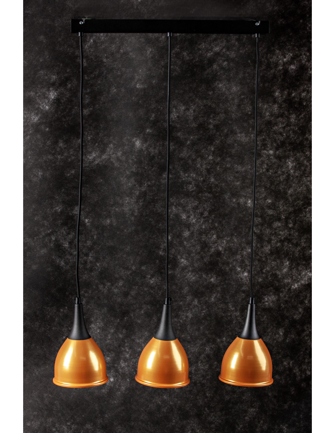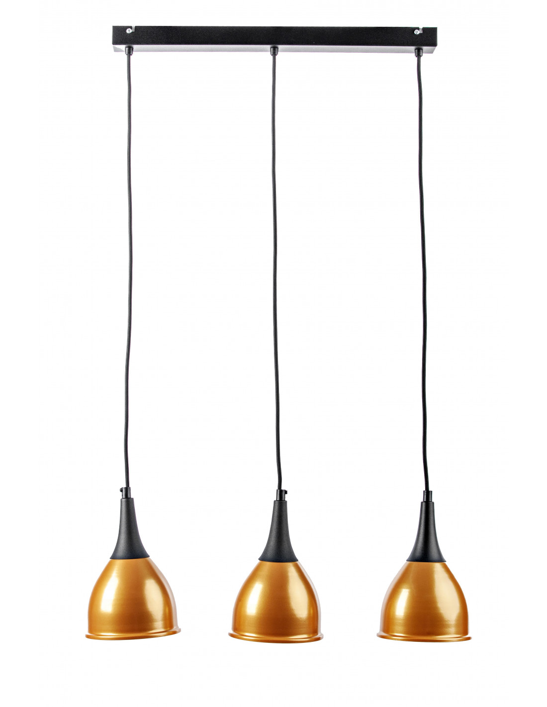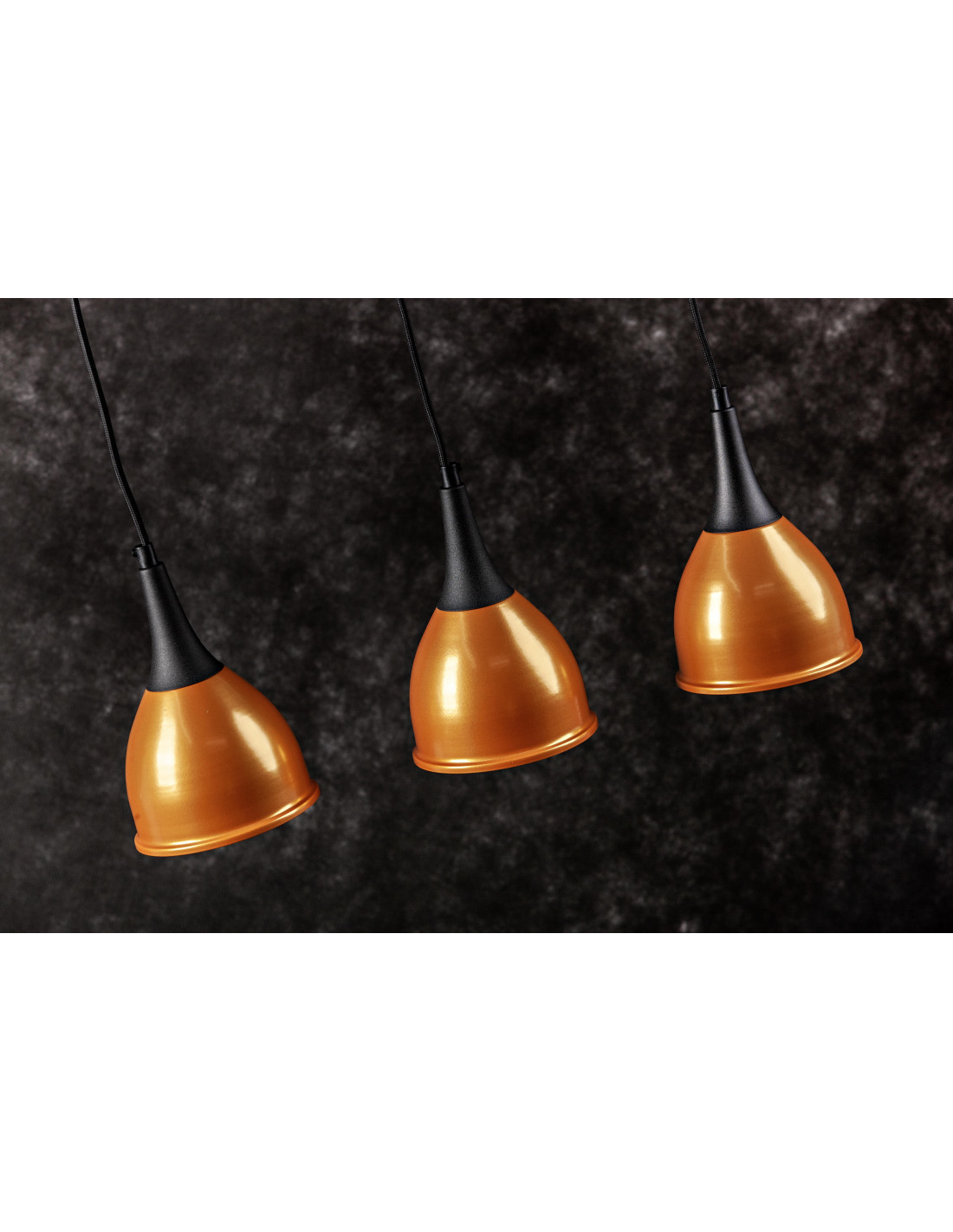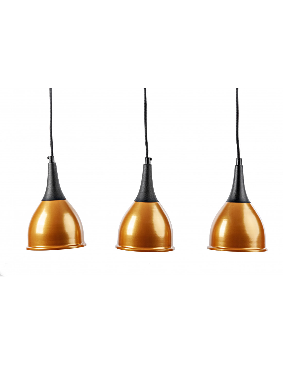 Lampa Monic III w kolorze złoto-czarnym, charakteryzuje się niezwykle nowoczesnym kształtem klosza wykonanego z metalu, swoim kształtem przypominającego krople wody. Lampa jest nowoczesna i niepowtarzalna. Dopełnieniem designu lampy jest kabel w bawełnianym czarnym oplocie. Lampa ta stanowić będzie idealne uzupełnienie nowoczesnych aranżacji.