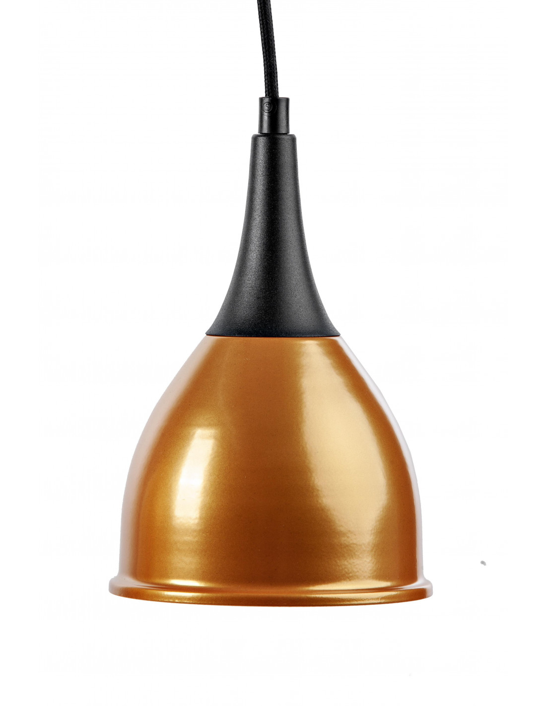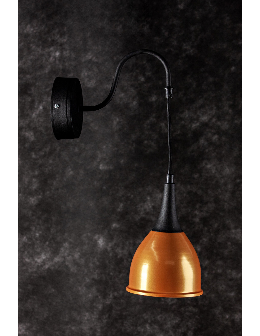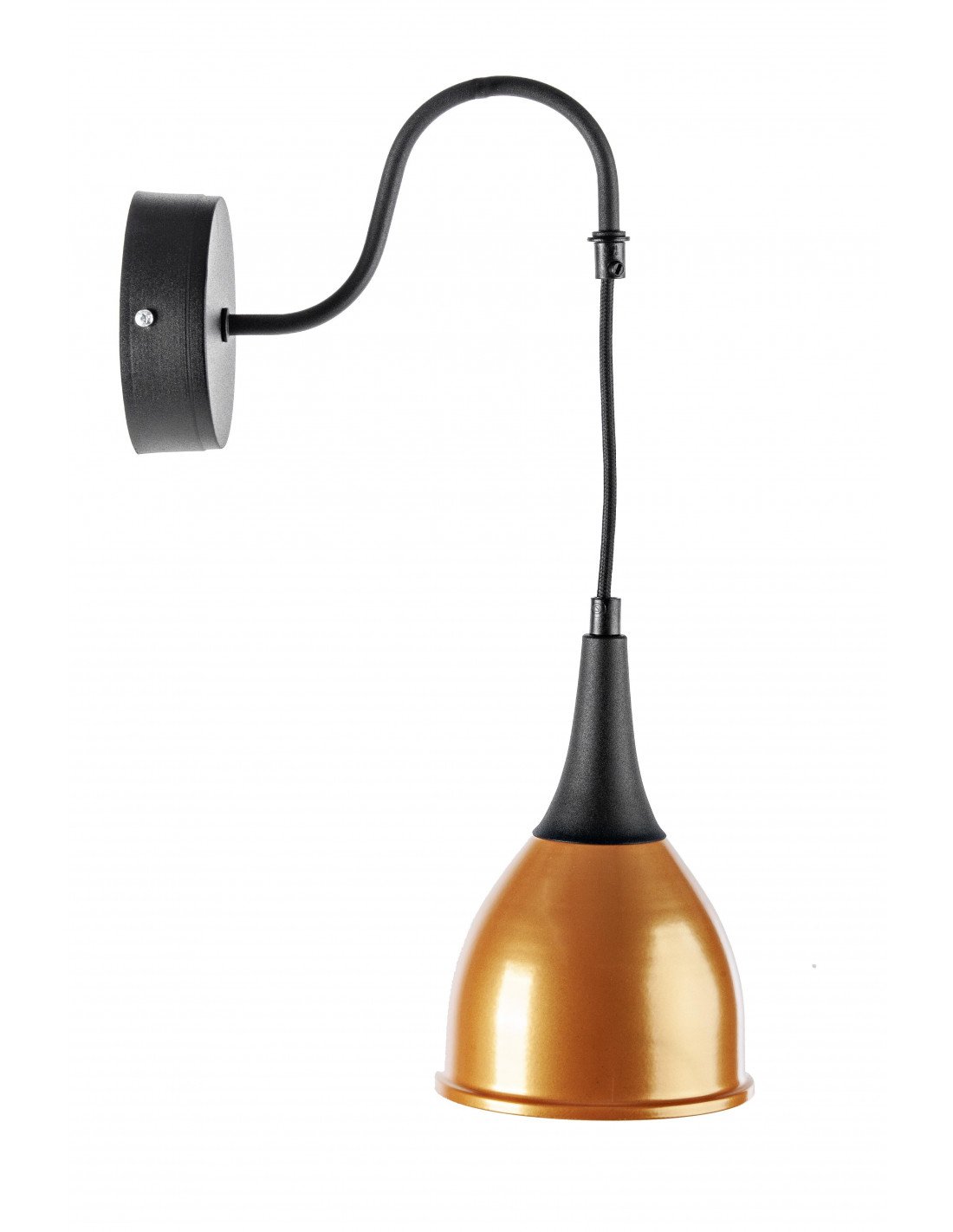 KINKIET MONIC 1 CZARNO-ZŁOTY -unikatowa bryła w kształcie kropli wody,unikatowa regulacja wysokości(możemy podwyższać i obniżać klosz za pomocą kabla i blokady). Uzupełnieniem bryły jest kabel w czarnym bawełnianym oplocie.Świetne połączenie kolorów: złota z czarną strukturą i niespotykany design, nada każdemu wnętrzu charakteru.