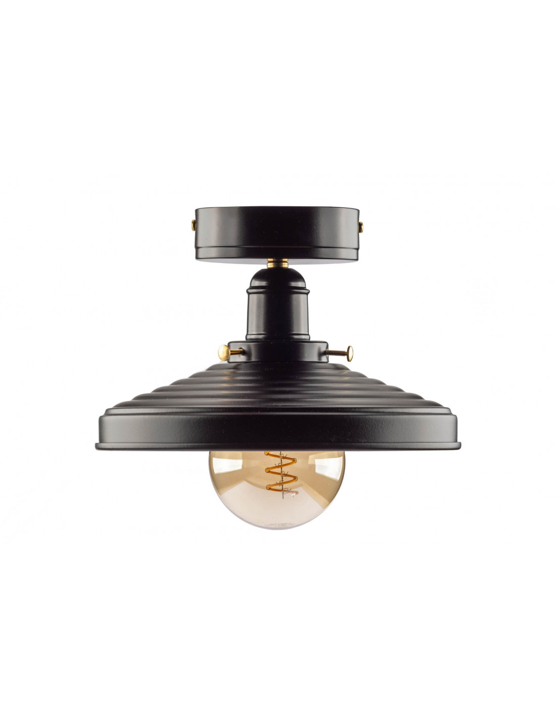 Plafon industrialno-loftowa TB/SPS/TFD wykonany jest w całości ze stali i elementów z mosiądzu. By uzyskać efekt taki jak widzimy,blacha została poddana ręcznemu wyoblaniu.Całość lampy została pomalowana w kolorze półmatu czarnego. W lampach tych świetnie sprawdzą się żarówki vintage,które będą dopełnieniem designu lampy.