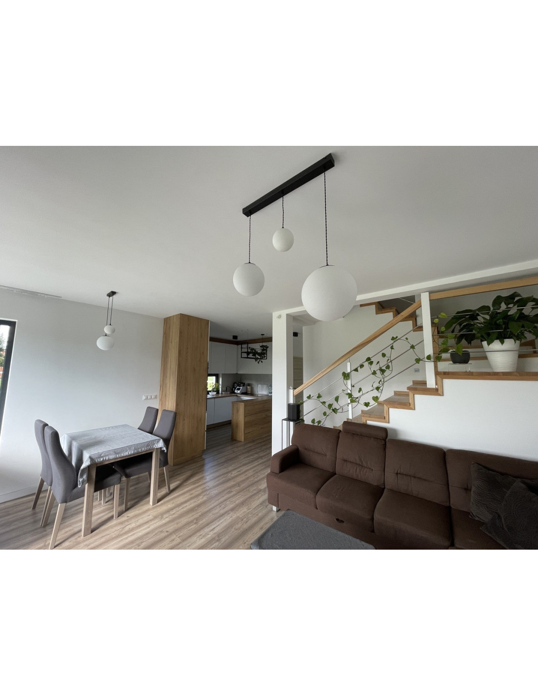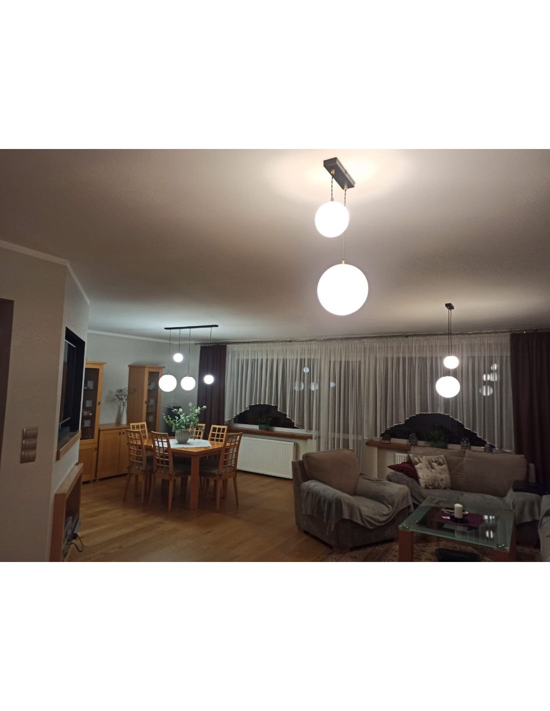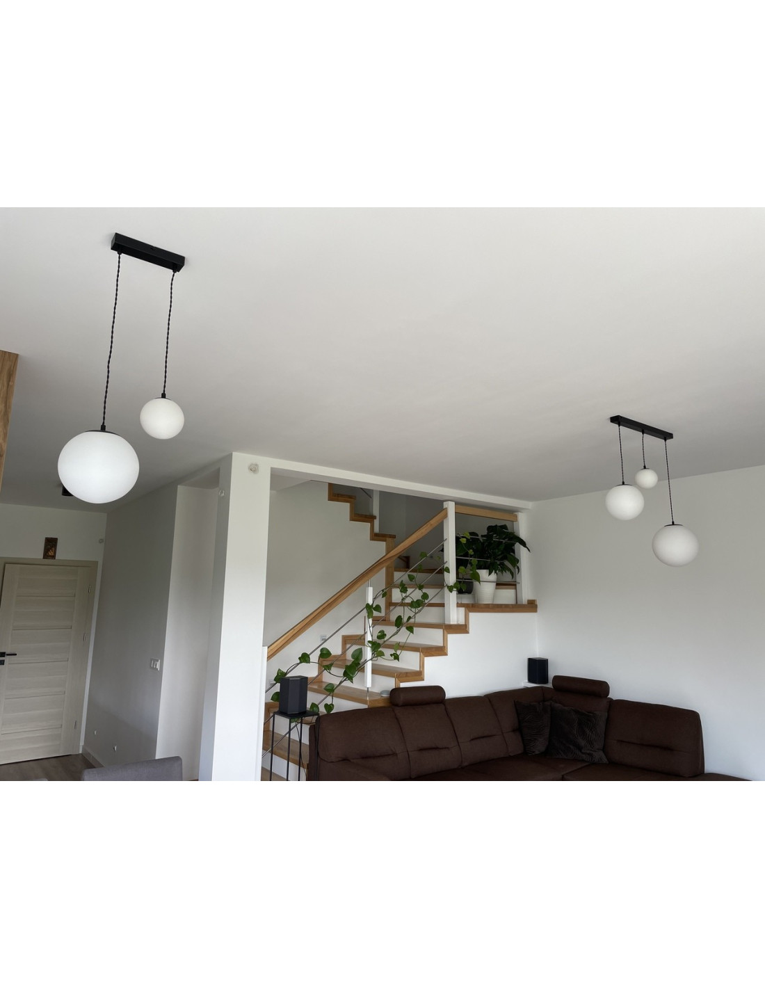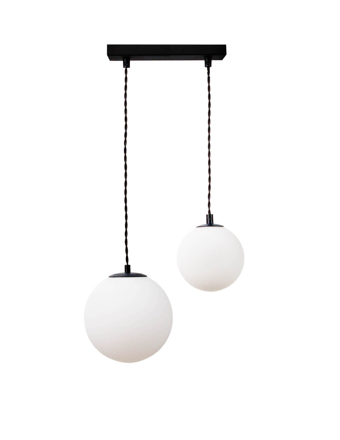 ZINGA 2L/BLACK- lampa wisząca w kolorystyce biało/ czarnej, charakteryzująca się ładnym, spokojnym designem. Dopełnieniem lampy jest czarny podwójnie skręcony kabel bawełniany. Do wykonania jej użyliśmy dwóch wielkości kloszy szklanych opalizowanych o średnicy: 200 i 120 mm. Lampa została zaprojektowana asymetrycznie. Kule możemy dowolnie powiesić na belce 200 mm pomalowanej w kolorze czarnej drobnej struktury.
