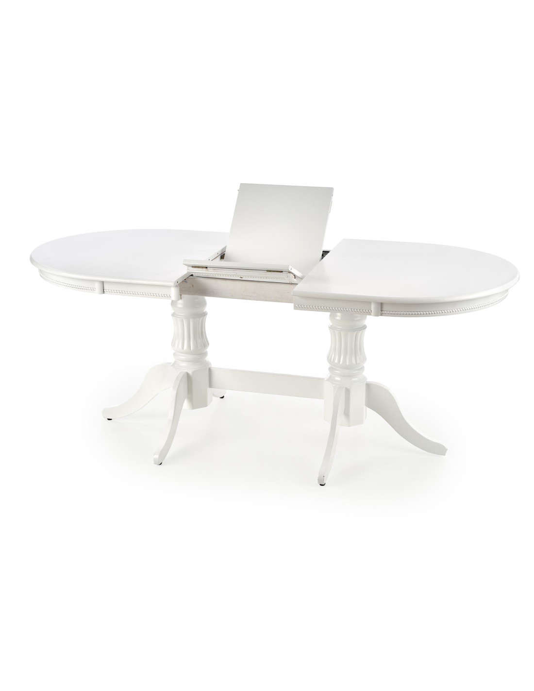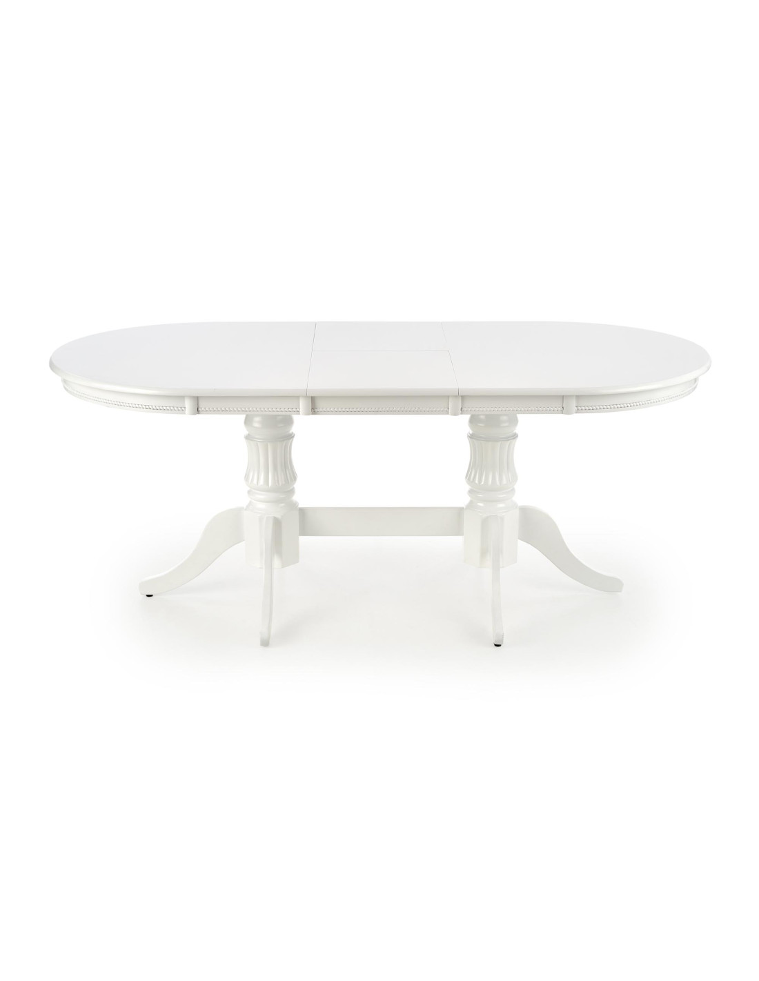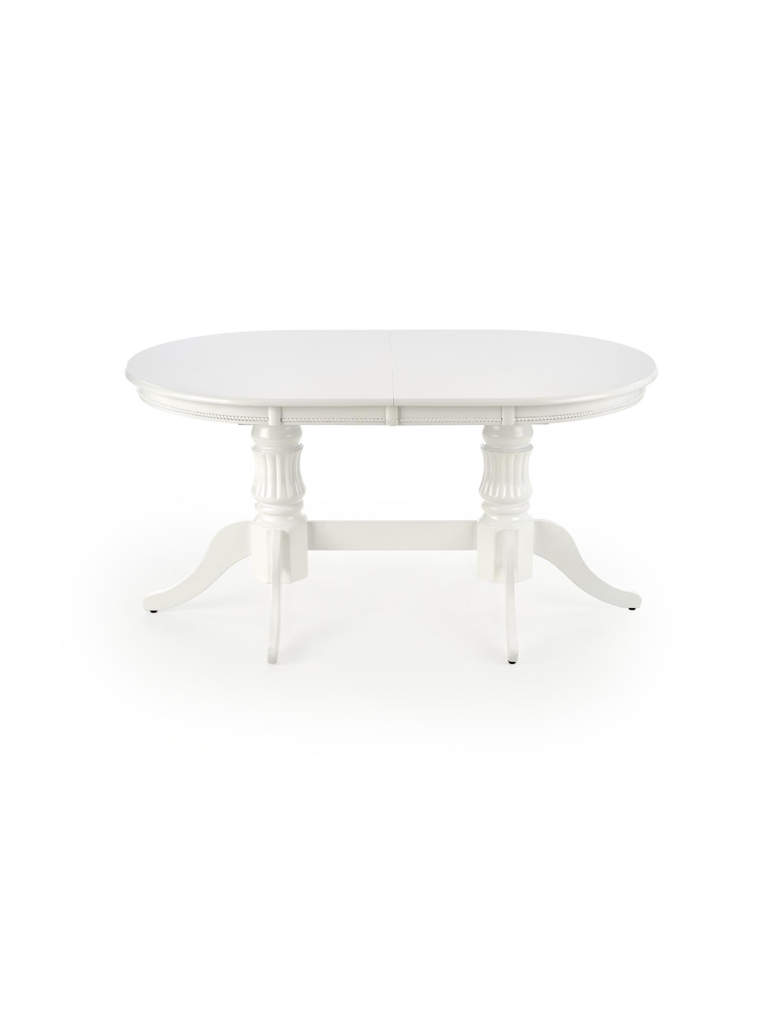 Nadaj styl swojemu wnętrzu z rozszerzanym stołem JONAH, który łączy w sobie klasyczną elegancję z nowoczesnym wykończeniem! Ten biały stół, wykonany z MDF lakierowanego oraz litego drewna, przyciąga wzrok swoimi dekoracyjnymi, rzeźbionymi nogami oraz owalnym kształtem z zaokrąglonymi krawędziami. Idealnie wpasuje się w eleganckie i czyste aranżacje, tworząc atmosferę przytulności podczas rodzinnych spotkań.